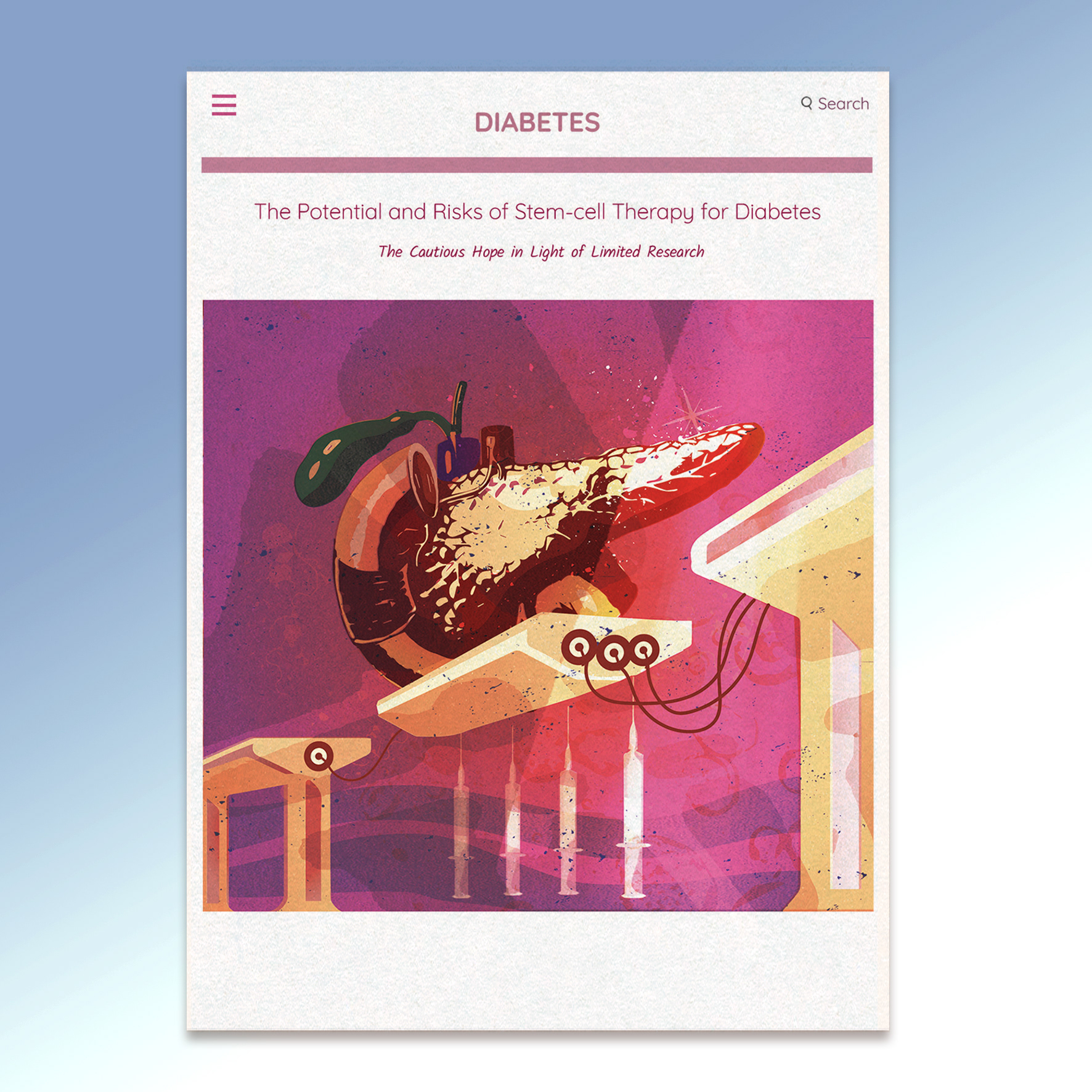 This project is for an article exploring the possibilities and risks of stem-cell therapy for diabetes, emphasizing a message of cautious hope. The artwork balance optimism and scientific uncertainty.